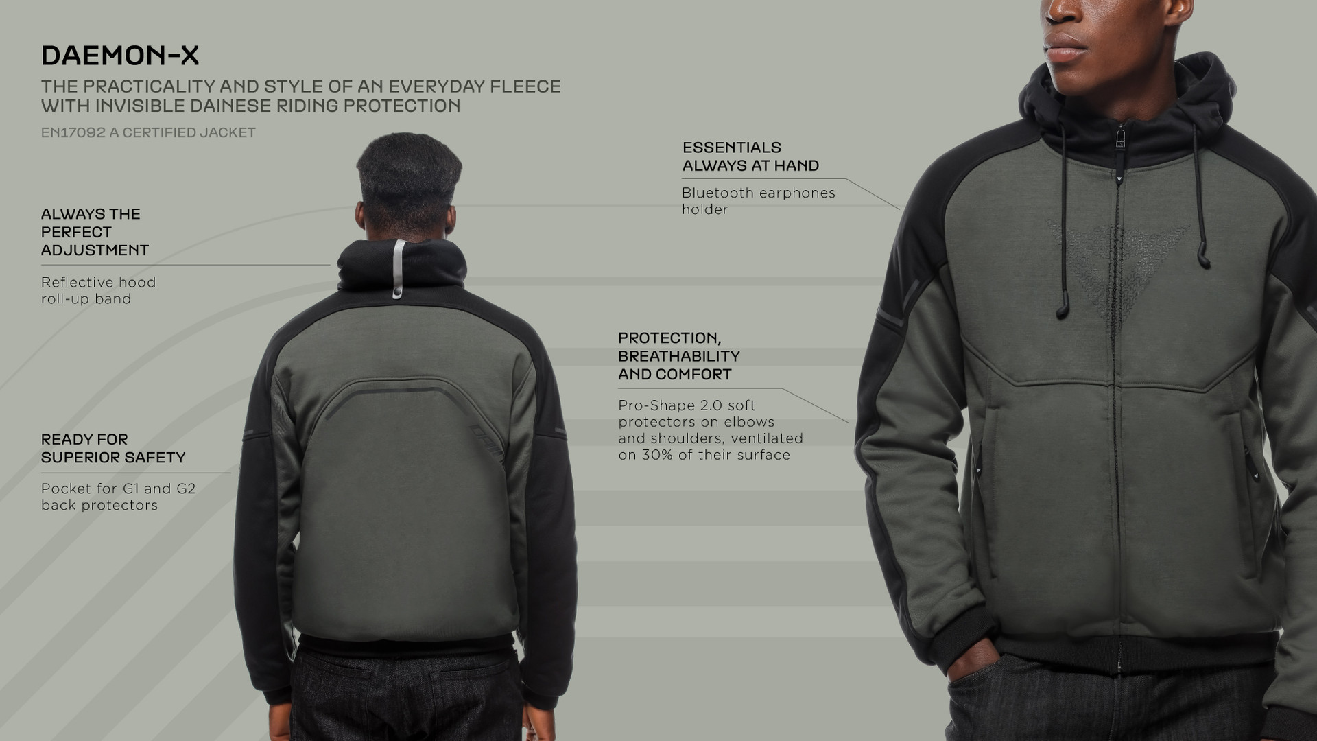 Made of soft fabric, Daemon-X Safety Hoodie is an extremely comfortable and versatile motorcycle sweatshirt. The fit is comfortable and casual due to the Pro-Shape 2.0 protectors on shoulders and elbows, not bulky or visible. The protection levels are also increased by a design that can accommodate a back protector, the pocket model G.