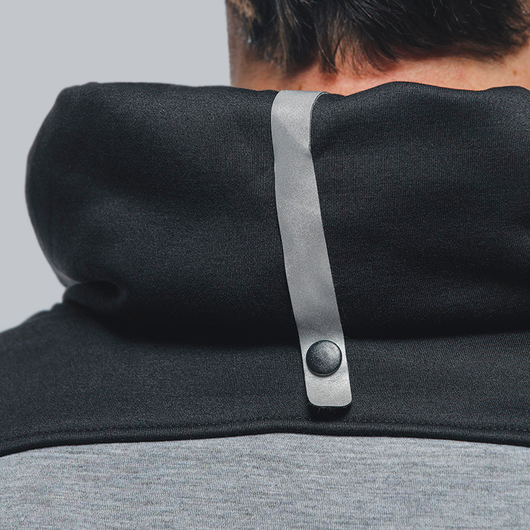 Equipped with one internal and two external pockets for storing small items safely, the sweatshirt offers the possibility of attaching a Bluetooth earpiece on the hood drawstrings, making the garment extremely functional and practical.
