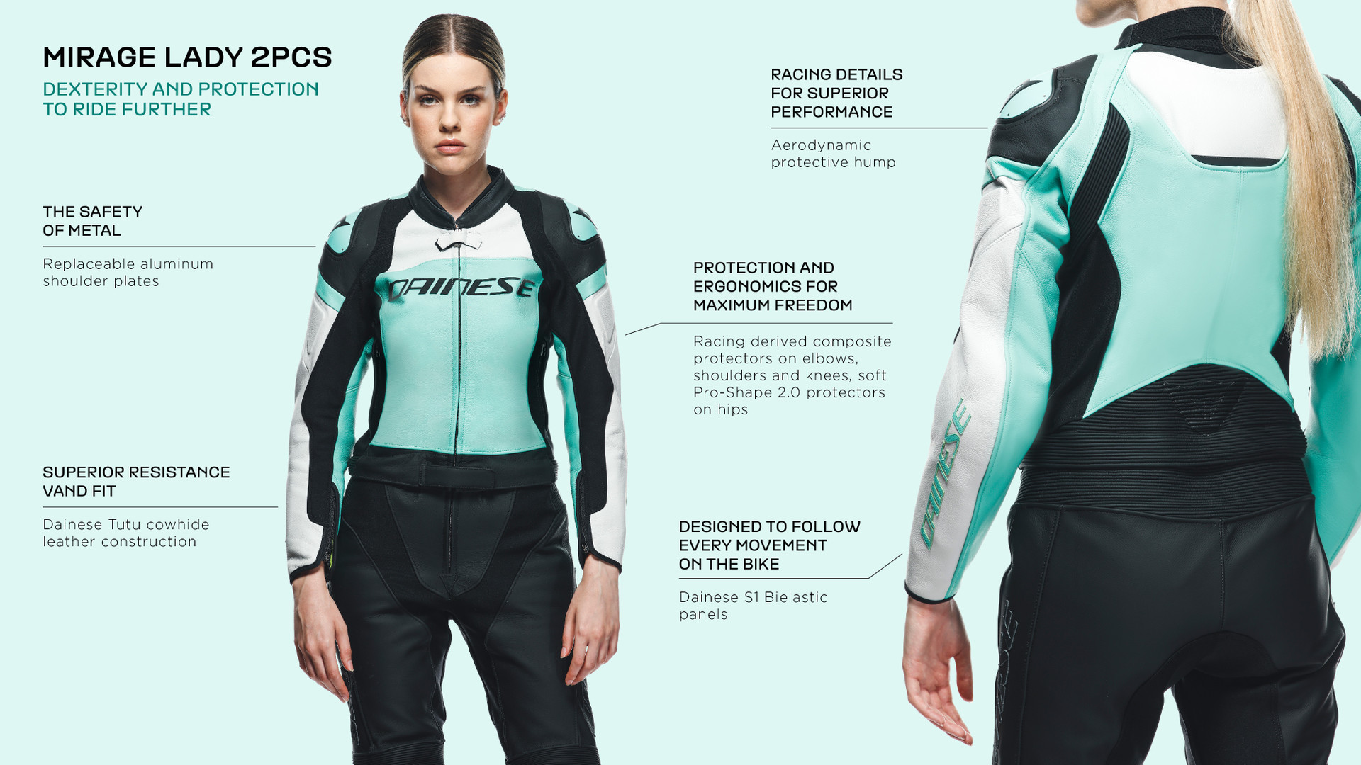 Women's Dainese Mirage two-piece motorcycle suit made with premium Tutu cowhide and ergonomically designed to best suit a woman’s body. Suitable for sport use, it is specifically optimized for road riding.