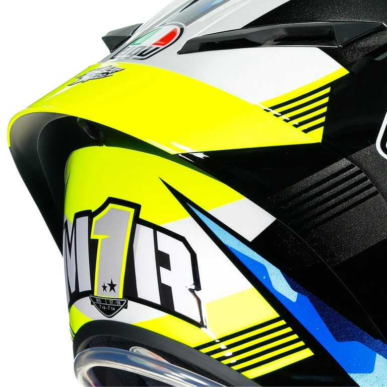 The helmet of the MotoGP™ World Champion, the only one with M1R decorations to celebrate the 2020 season victory The same AGV PISTA GP RR used by Joan Mir when racing in his season as reigning champion, available in a special edition. Pista GP RR is an exact replica of the AGV helmet used in races by world champions. It therefore has FIM homologation, which certifies the highest possible level of protection, even against any dangerous twisting of the head. Every detail is designed to ensure ultimate performance. The Extreme Carbon shell in 100% carbon fiber guarantees extraordinary lightness, which makes it effortless to wear. Its shapes and metal air vents are studied in the wind tunnel and tested by AGV athletes in order to ensure the best aerodynamic penetration and the greatest stability at high speeds, also due to the innovative profile of the rear PRO Spoiler. Boasting 5 mm thickness, the optical class 1 Ultravision visor is an integral part of the protector that allows 190° panoramic vision. This means the rider sees the track, adversaries, and obstacles more clearly, before anyone else. The exclusive 360° Adaptive Fit system allows for complete customization of the interior, giving the rider the possibility to select the ideal thickness for the upper part of the head, nape, and cheeks. This essential comfort leaves the rider free to concentrate on nothing but their goal. Every detail is designed with winning in mind. The Perfection of Obsession. *Pista GP RR MIR 2021 reproduces the graphics used by Joan Mir in races for the 2021 season, with the exception of sponsors and visor details.