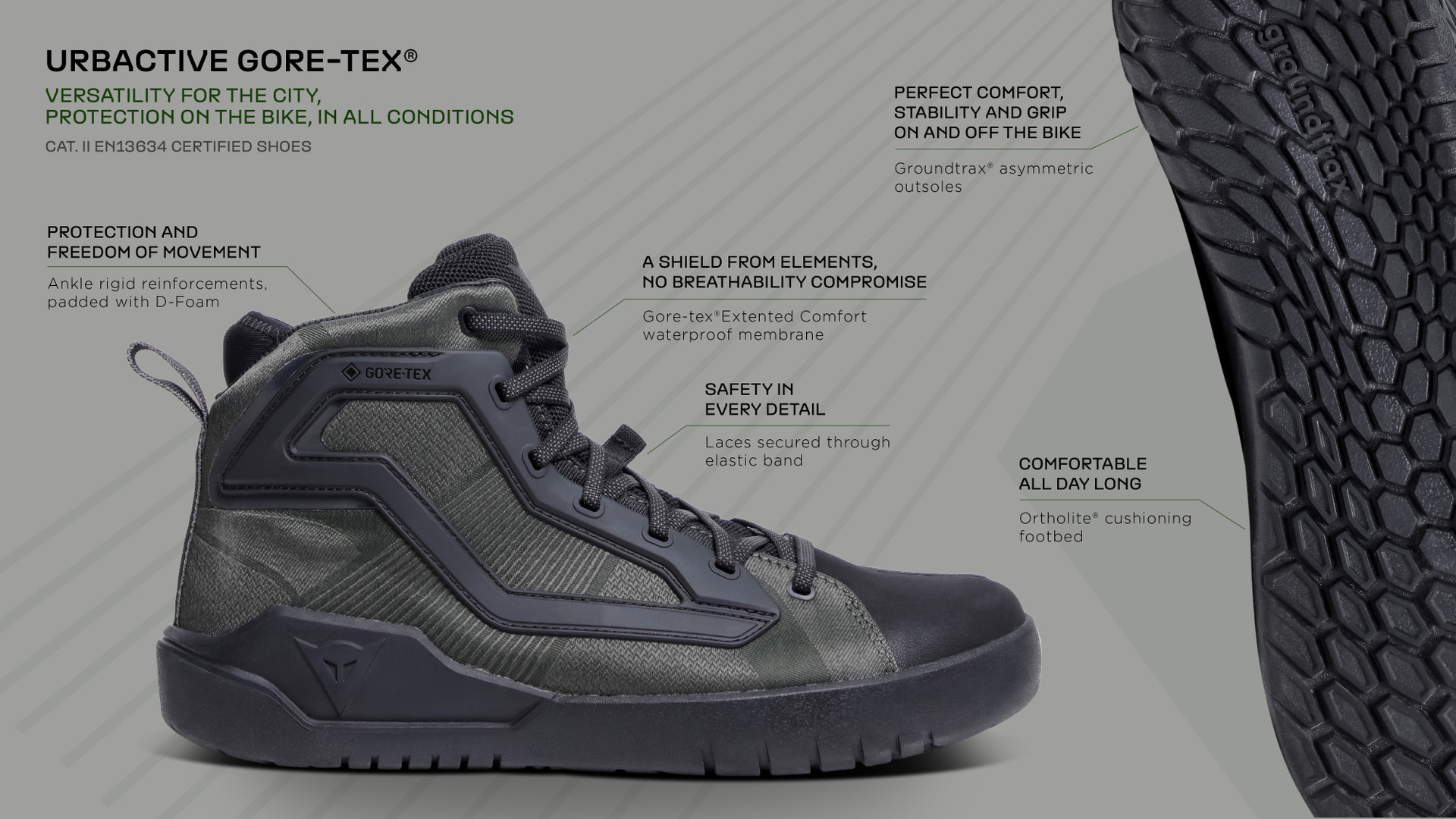 The soles are designed to ensure maximum resistance to deformation on impact, and are made with Groundtrax® technology, which guarantees comfort, stability and grip on the foot pegs, so that Urbactive Gore-Tex Shoes are extremely comfortable and suitable for constant use throughout the day. Comfort is also enhanced by their lightness, which increases walking comfort. The Ortholite® insole guarantees maximum breathability and long-lasting cushioning.
